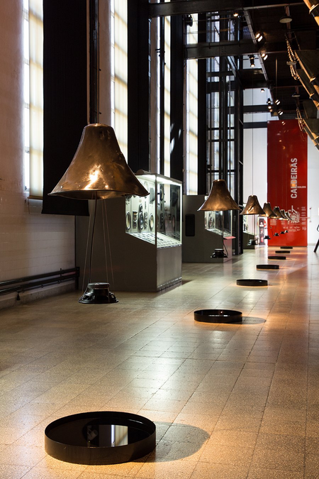 The title of the exhibition conceived by Pedro Tudela for the Boiler Hall at Tejo Power Station is awdiˈtɔrju – the phonetic transcription of the word auditorium in Portuguese. In reality, the entire Boiler Hall space will become a stage for an immersive experience which combines a sound piece that accompanies three moments throughout which the space is inhabited by one sculpture and two installations, in a meticulously-designed choreography based on elements such as a suspended bell (made specifically for this context) in a fragile balance with wings lying on the ground, seven bell jars dripping into as many black holes, and a hallway of light covered by transparent tiles.