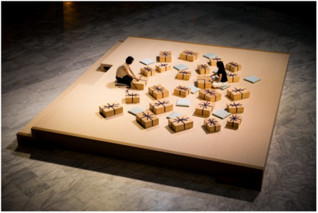 Picture: Lee Mingwei, Fabric of Memory 2006–present. Mixed media interactive installation, Wooden platform, wooden boxes, fabric items, Installation view Lee Mingwei and His Relations, Taipei Fine Arts Museum, 2015, Courtesy: Taipei Fine Arts Museum