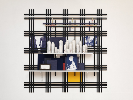 Picture: Remy Jungerman, WISE WORDS, cotton textile, kaolin (pimba), gin bottles, photo prints, tile, map, wood, 172 x 173 x 23 cm, 2010, Courtesy the artist and Galerie Ron Mandos, Photography: Aatjan Renders