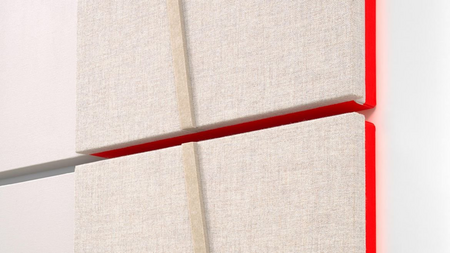 Classifiable as neither paintings nor sculptures, many of the works in the exhibition feature architectural felt and acoustic panels to create what Jones calls “active surfaces.” By absorbing sound, these materials affect the acoustic properties of their environments and invite participation in an embodied mode of perception.
