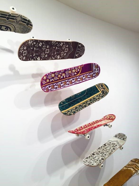 Picture:Â Mounir Fatmi, Maximum Sensation, 2016, skateboards, prayer rugs, approximately 90" H x 192" L x 12" D