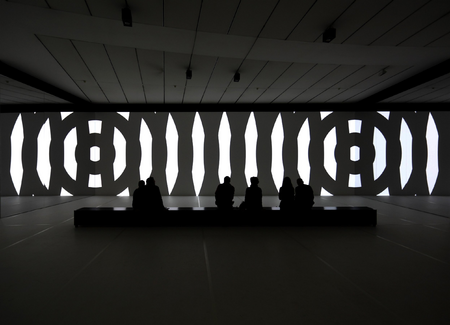 Picture: Carsten Nicolai, unidisplay, 2012, real-time projection, large-scale screen, mirror walls, bench with loudspeakers, dimensions variable, Exhibition Views, Museum für Modern Kunst Frankfurt am Main (MMK), Photos: Axel Schneider, courtesy Galerie EIGEN + ART Leipzig/Berlin and Pace Gallery, VG Bild-Kunst, Bonn 2021