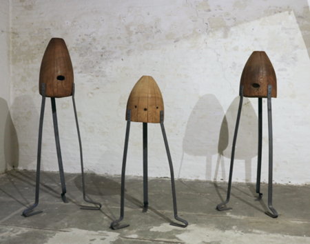 Bild: "Kopffüßler" von Martin Langer, Eichenholz und Stahl, Höhen: 1,60 bis 2,10 m