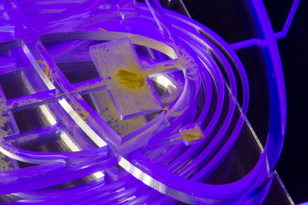 The work meditates on feedback mechanisms between human and non-human life forms bonding through body fluids. The fluid in the sculpture includes Human Milk Oligosaccharides (HMOs), potent sugars found in breastmilk that feed babies’ gut bacteria and seem to shape the development of their nervous systems.Â