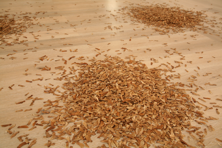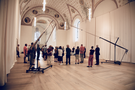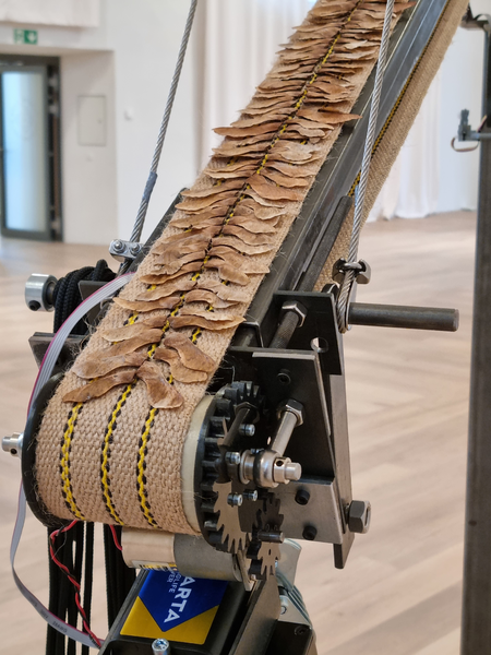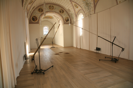 Die Installation „Im Fluge“ besteht aus drei Förderbändern, die auf ein Zentrum im ehemaligen Kirchenraum des Kulturforums Klosterkirche ausgerichtet sind. Ausgelöst durch Bewegungsmelder setzen sich die Förderbänder nur in Gang, wenn Besucherinnen und Besucher den Raum betreten. Transportiert werden Ahornsamen, die in serieller Reihung auf den Bändern angeordnet sind und mechanisch befördert werden, bevor sie dann in charakteristischer Propellerdrehung sachte aus einer Höhe von etwa sechs Metern zu Boden fliegen. Der Linzer Bildhauer Josef Baier hat mit der Installation „Im Fluge“ ein Kunstwerk geschaffen, dessen Wirkung temporär, flüchtig und variabel ist.