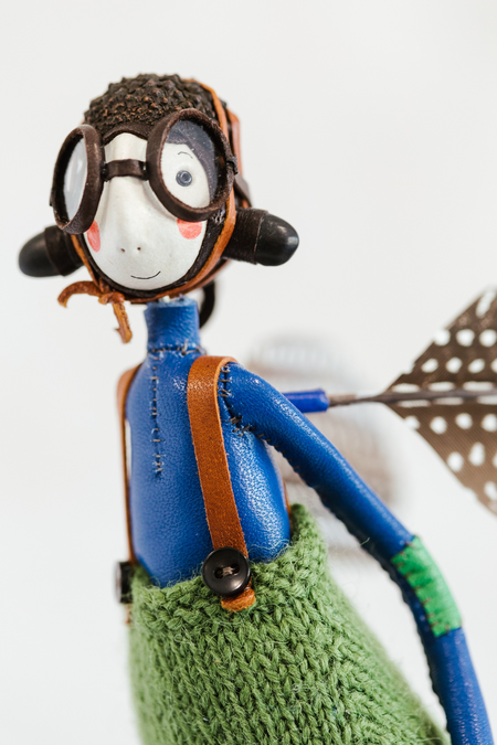 For two decades Bryan has been making humorous yet industrious fairy-like creatures; adorned with items from her eclectic hoard of buttons, spotted feathers, seed pods, dyed leathers, and contraptions influenced by Victorian flying machines. She combines these materials and found objects to inform their intriguing personalities.
