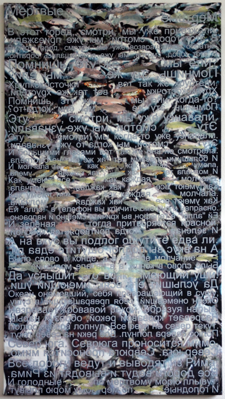 Die Auseinandersetzung mit menschlichem Handeln und menschlichem Irren treibt mich seit langem um und erhält eine vielschichtige Aktualität in Bezug auf die dramatischen globalen Entwicklungen in Umwelt, Gesellschaft, Wissenschaft und Politik. Auslöser für die Arbeit waren Alina Vituchnovskajas Gedicht Tote Fische und ein großes Fischsterben im Jahr 2004. Ein digital bearbeitetes Foto von toten Fischen wurde überlagert mit dem Gedicht in kyrillischen Buchstaben -original und seitenverkehrt- um eine abstrakte, an Wasser erinnernde Textur zu erzeugen. Die Worte Fisch und Fische im Gedicht sind wegretuschiert und jeweils durch einen auf Japanpapier gemalten Fisch ersetzt.