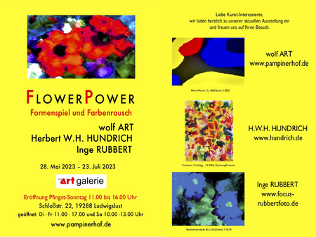Die Dependence des kulturforums fine artGalerie in Ludwigslust, Schloßstr. 22, lädt ein zu FlowerPower mit Bildern von wolf ART, Herbert W. H. Hundrich, Inge Rubbert.