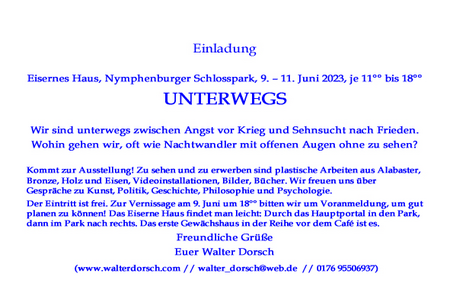 Ausgestellt sind meine wichtigsten plastischen Arbeiten, auch ganz neue aus Alabaster, Videoinstallationen, Kurzfilme und digitale Gemälde mit Bezug zu Kunst, Politik, Geschichte, Philosophie und Psychologie. Ihr seid herzlich eingeladen, unter dem Motto UNTERWEGS mit anderen Besuchern und mir über alle möglichen Themen zu diskutieren, über die Strukturen der Macht, die alte  weißen Männer, die Rolle der Frauen im Christlichen Abendland, über Putins Krieg, was die berechtigte Angst der muslimischen Frau mit der Angst der Männer zu tun hat, wie Glück entsteht und vieles andere mehr! Musikalische Darbietungen von Kyrill Korsunenko, der leider aus Termingründen nicht zugegen sein wird, knüpfen an die erfolgreichen Benefizveranstaltungen des letzten Jahres an