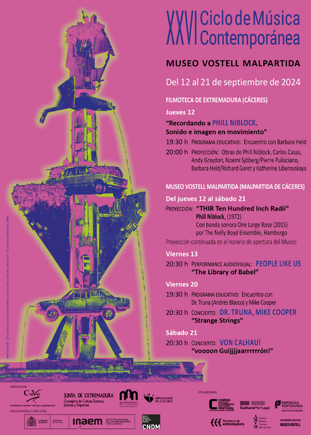 The 26th edition of Museo Vostell Malpartida´s Ciclo de Música Contemporánea begins on 12th September with an expanded programme (at the Filmoteca de Extremadura in Cáceres) celebrating the legacy of composer and artist Phill Niblock, who sadly passed away earlier this year. The works included in this unusual programme explore concepts and strategies that diverge from what we normally understand as ‘audiovisual’ –that is to say, ‘sound and image in movement’– and in a certain way are connected with the first concert of the series, to take place on 13th September at Museo Vostell Malpartida, which will consist of the Spanish premiere of the latest audio-visual performance by People Like Us, created following the formula of collage: ‘cut and paste’.
