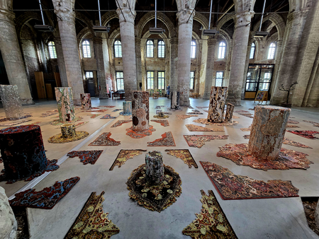 She creates a fairytale forest with totem trees. Each totem tells its own story, to show how we interact with nature. Discarded jewelry and other remnants of prosperity proliferate across the aluminum trunks. Like fungi or bugs, they try to find a way and thus symbolize our consumer society. Cut open carpets form the paths of the labyrinth, to take the step to recognize things and find the power to choose.