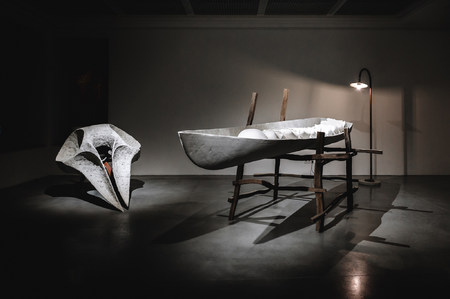 The exhibition also delves into the relationship between civilization and nature, exploring its evolving dynamics. Here, visions of dreams, threats, and a sense of a post-apocalyptic world emerge, accompanied by a distinctive brutal aesthetic. The artist experiments with various materials, seeking unexpected ways to use them. While previous exhibitions of Tauras Kensminas only subtly hinted at moods of unease and uncertainty, in “Bay”, the themes of survival and disappearance are more pronounced, openly expressed, yet still conveyed through a metaphorical and enigmatic narrative style.