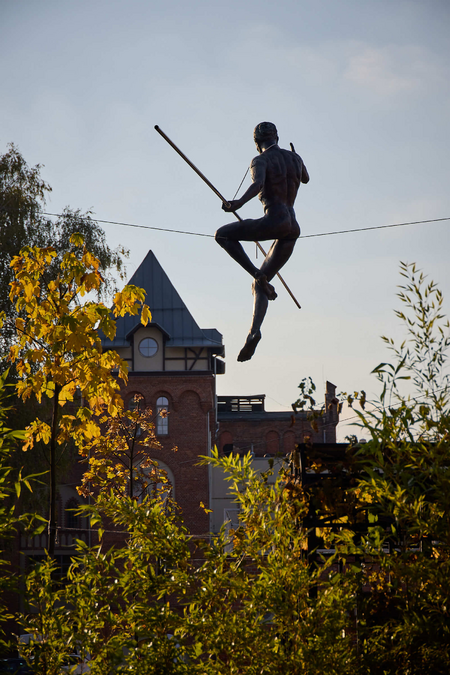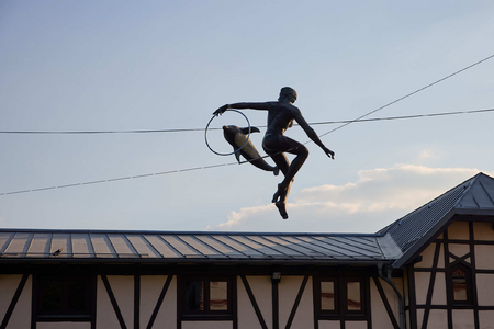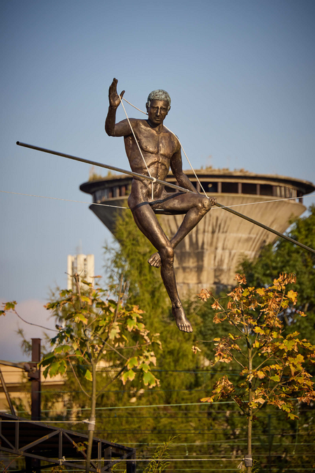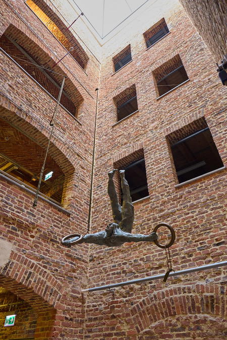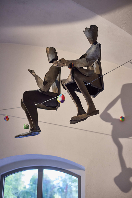The exhibition is designed as a two-part composition. The outdoor section, available since early September, features iconic balancing sculptures – globally unique artworks suspended above the ground, a signature invention of Kędziora. Among them are works embodying grotesque metaphors of transformation (e.g., Acrobat with a Chair, On a Broken Hoop), as well as more naturalistic figures connected to the world of circus and acrobatics (The Waving One, The Trainer). The group also includes pieces exploring femininity (Playing with a Dolphin) and formal experiments blending balancing sculpture with so-called “flattened forms” (The King and The Queen). The entire outdoor showcase forms a cohesive, Upper Silesian premiere mini-retrospective that also contributes to the artist’s global project – Balancing Figures for the Protection of Cultural Heritage.