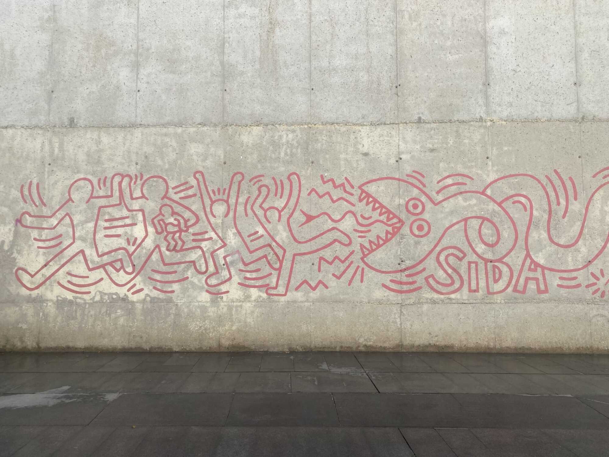 On the same wall is Keith Haring’s mural Todos juntos podemos parar el sida (1989, restored in 2014). In the same square, we will also encounter Jorge Oteiza’s sculpture La Ola (1998), part of the MACBA Collection in public space.