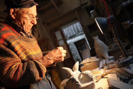 The dust of the workshop has crawled under Picenoni's fingernails. The lower joint of his middle finger is rheumatically swollen and his finger crooked. His hands had worked many hours and dragged countless stones. Picenoni started out as a bricklayer. He made his first figures out of cement half a century ago: an eagle, a fox, a lamb. The figures still stand in his workshop today. On the fox’s snout sit dusty sunglasses. Picenoni taught himself how to sculpt with these stones. In the beginning, his left hand was blue because of how often he had missed with his hammer.