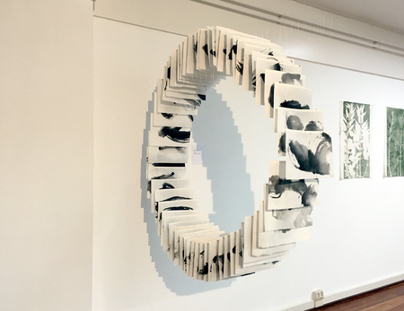Breath (2018) by Cindy van Woudenberg literally wants to draw attention to our breathing. The first and last thing we do in our lives. The quality of the air we breathe. The meditative value of breathing. The breathing of our ancestors and of future generations. On each sheet of rice paper there is a breath, consisting of inhaling and exhaling. As usual in the tradition of Sumi-e, the ink is rubbed for the mental preparation of the work. The brush is carefully filled with the Sumi ink before beginning work. Without a preconceived plan, the brush follows inspiration and exhalation on the paper. Each breath is influenced by the previous breath and the corresponding breaths. In this installation, 58 breaths hang in a circular form. All the breaths hang in order, no one breath is omitted, even the breaths that were not "outstanding". One does not always judge one's own breathing. The installation hangs and moves with air currents in the room. Seen in this manner, the work itself seems to breathe.