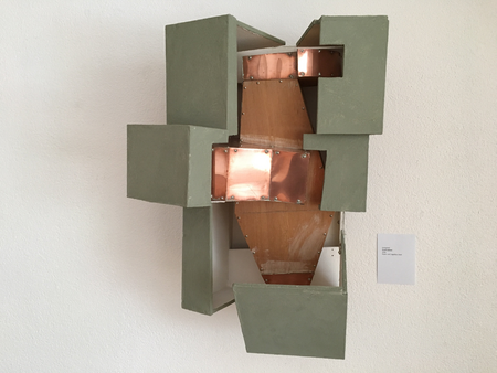 Geoff Salmon, Contained (2018); copper, paint, tile adhesive, wood; 105×60×50 cm;