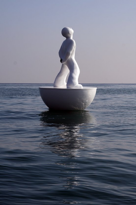 There are since 2010 two Miraestels floating in the water at the port of Barcelona from the area the Maremagnum next to Rambla del Mar. They are two large white human figures placed on a white hemispheres in the open sea.