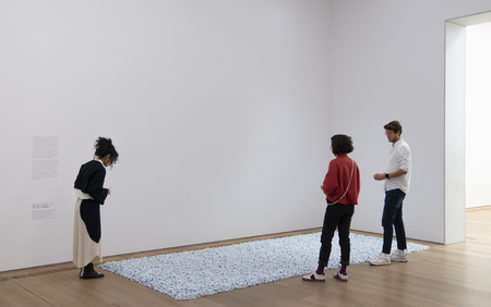 View of Félix González-Torres, Untitled (Lover Boys), 1991, spiral-shaped blue and white coloured candies in transparent foil, unlimited supply, total dimensions vary depending on presentation, ideal weight: 161 kg. © Estate of Félix González-Torres, Courtesy of the Félix González-Torres Foundation, Photo: Elisabeth Greil, Bayerische Staatsgemäldesammlungen, Museum Brandhorst, Munich