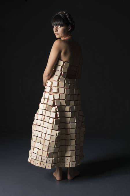 In contrast to Judith Mann's delicate moisture, Tamara Jacquin's work feels rather rough and edgy. For her project Body Architecture IV, she constructed a dress out of wood and then wore it herself during a performance. For the artist, the rather heavy, discomforting piece of clothing symbolises the burden that women have to carry within the framework of social expectations and also the irony that the things that are so heavy to carry are, to some extent, continually recreated by the women themselves. The dress literally makes her feel this weight herself.