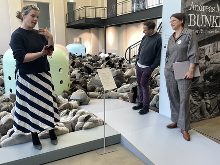 The cultural-philosophical and the art-historical context steps to the fore in the next exhibition room. Citations from the book Bunker Archaeology of French philosopher Paul Virilio published in 1975 cover the walls, next to them works by various artists. Given the present-day technology of war and military weapons, to Mühe, the assumption that bunkers can be protective spaces appears obsolete. Instead, he sees bunkers as documents of the devastating force of weaponry that can destroy any life, no matter how safe it may seem.