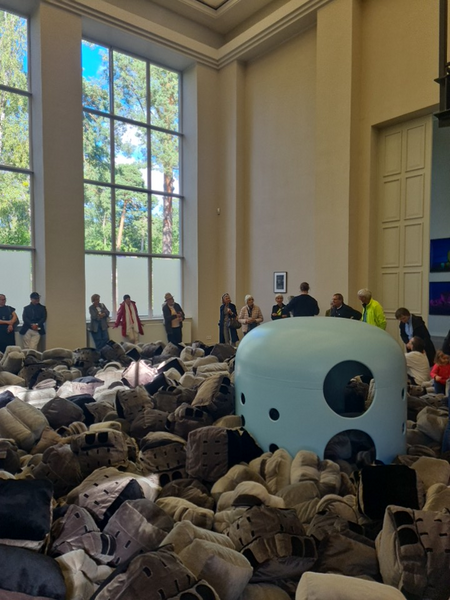 The first exhibition room displays a type of set design consisting of 6,000 plush fabric bunkers. Andreas Mühe had the Spielzeug Manufaktur in Bad Kösen produce eleven types of historical bunker buildings of a size suitable for children's hands. Colourful elements – true-to-the-original casts of DDR playground equipment – are placed amidst the grey fabric landscape. The cylinder-shaped structures are reminiscent of the so called “one-man-bunkers” installed by the ten thousandth in the German Reich during the Second World War and aimed at conveying the message that humans can find protection there – an imaginary, deceptive promise. Mühe's challenge to the visitors: leave the bunkers to the children, or have a bunker pool instead of a ball pool?