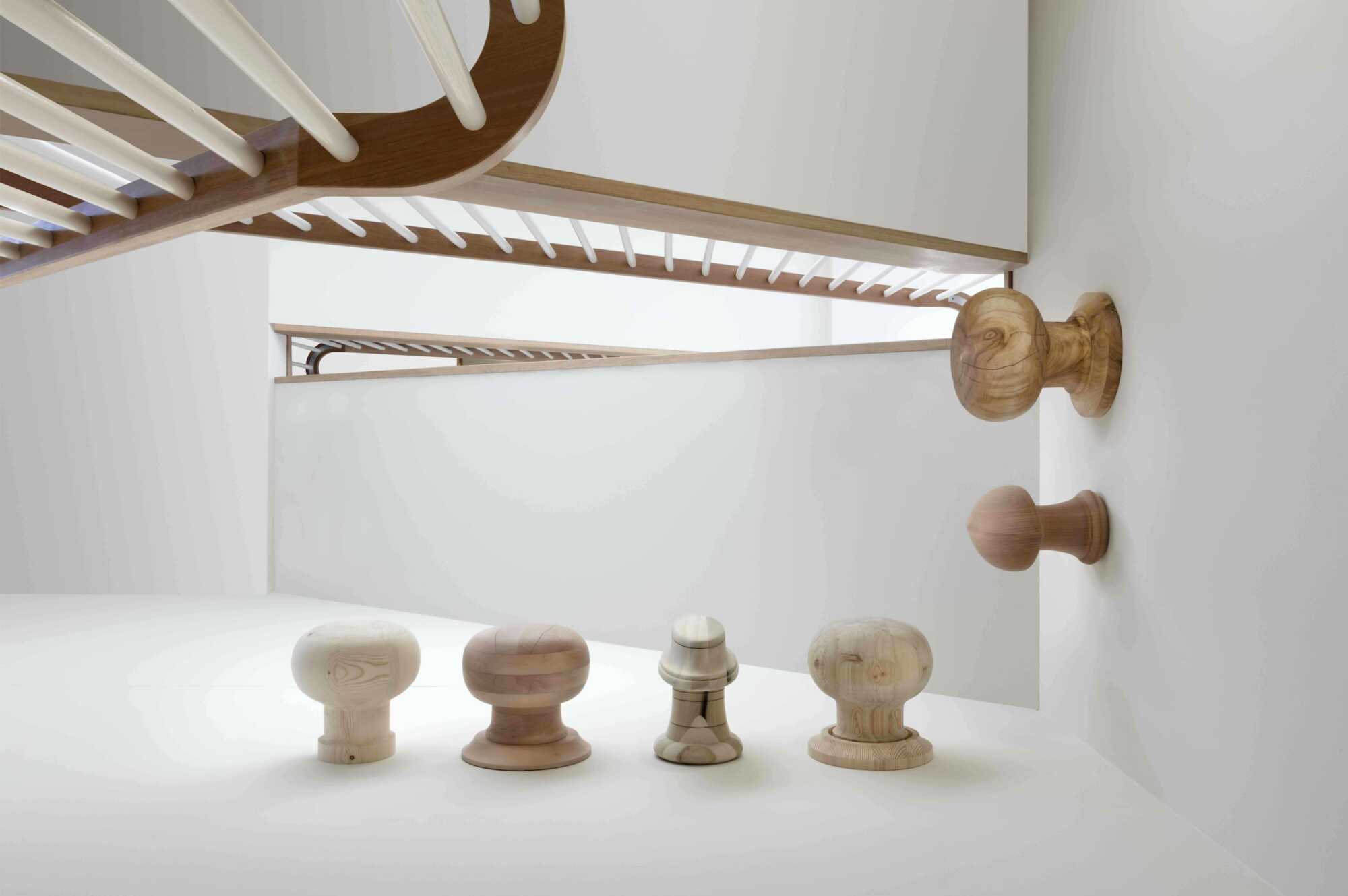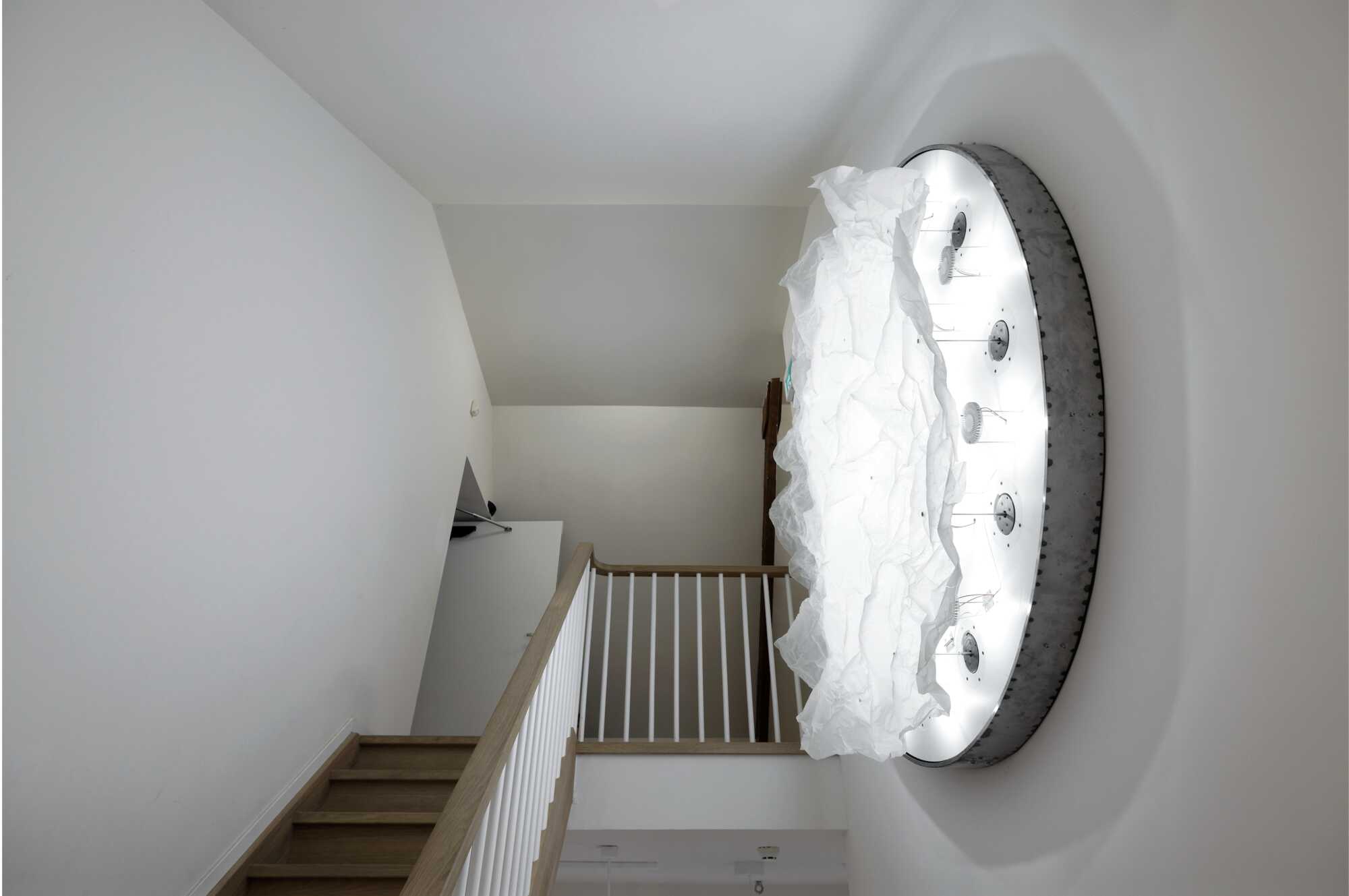 Timo Demollin’s Turns (2022) alters the perception of space through minimal interventions. This work is based on historical door knobs from the building dating from around 1880 to 1919, which have been transformed into abstract wall sculptures. The work evokes turning and changing direction – central aspects of movement in a stairwell. The sculpture has the effect of a spatial marker that makes visitors consciously aware of their own movement.