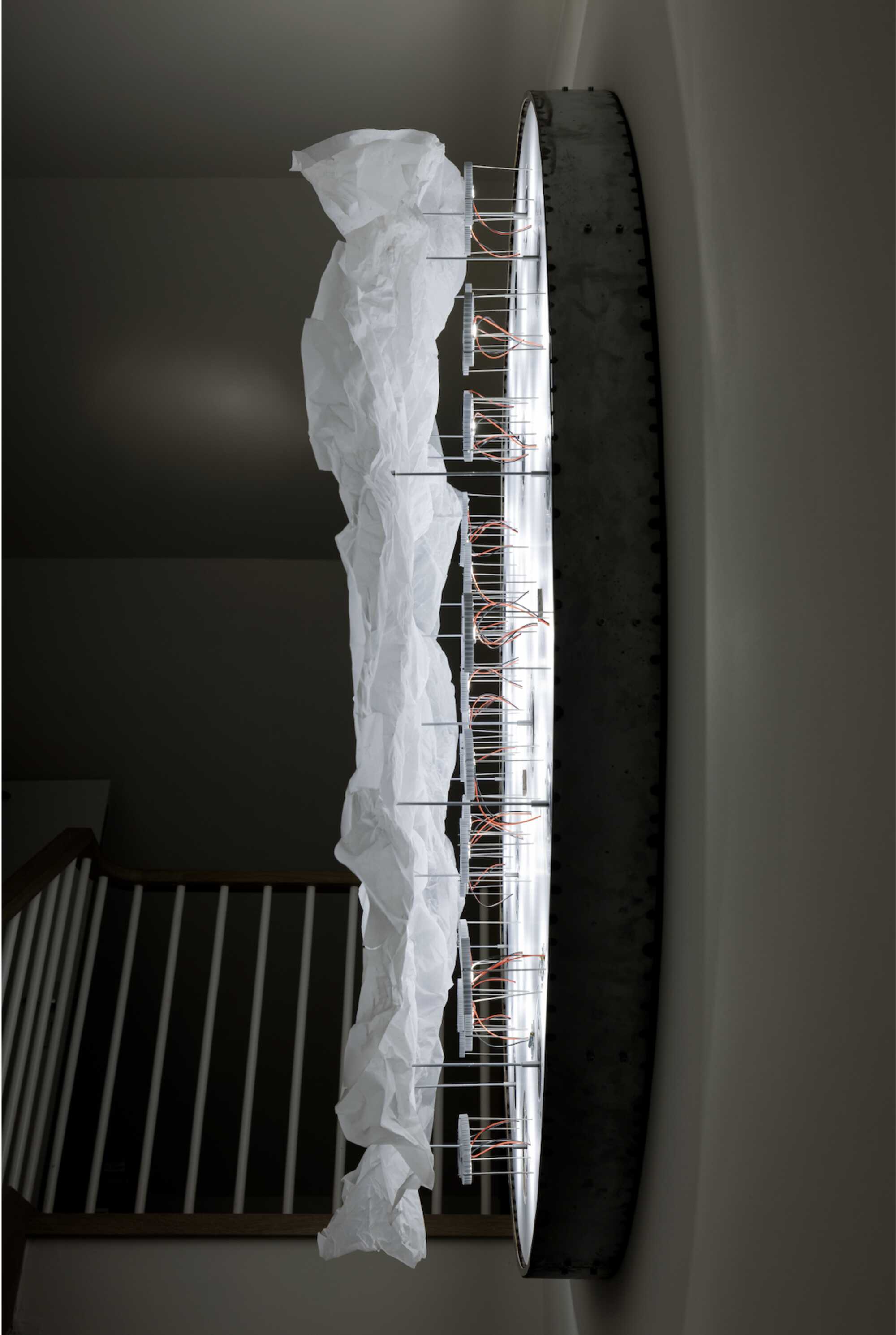 Zoro Feigl’s kinetic sculpture Phaethon (2024) explores movement both physically and metaphorically. An electromagnet causes a paper circle to vibrate, while high-frequency light flickers across its surface. As both rhythms are asynchronous, a visual state of levitation is created: Feigl’s work thus shifts the sculptural object from a fixed concept of work to an unstable counterpart in space, whose seemingly independent movement subtly disrupts the continuity and self-evidence of one’s own movement and, moreover, creates a dynamic within the space.