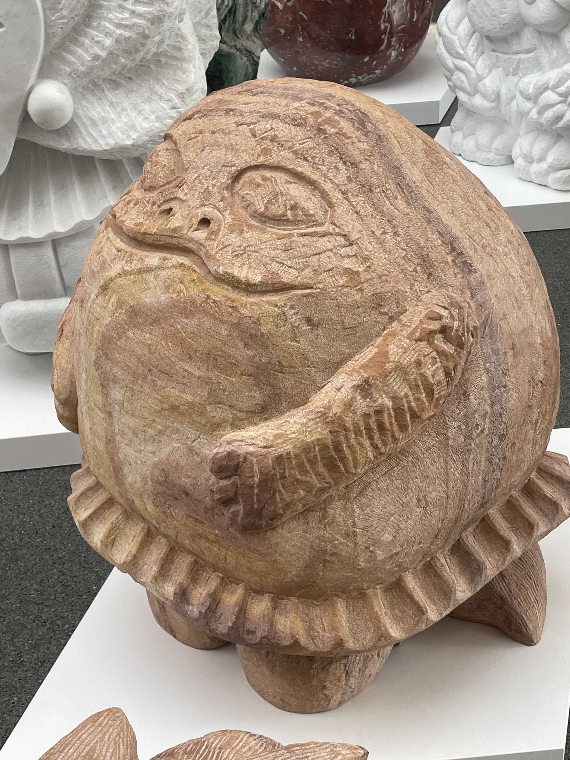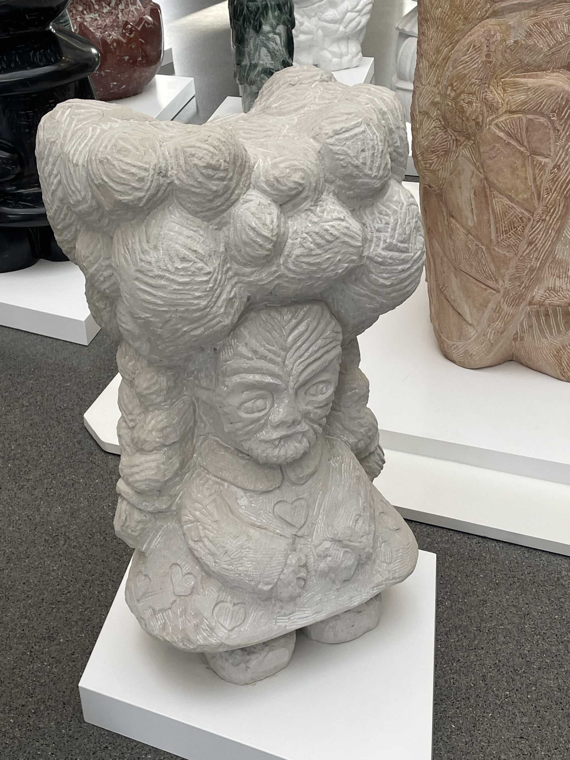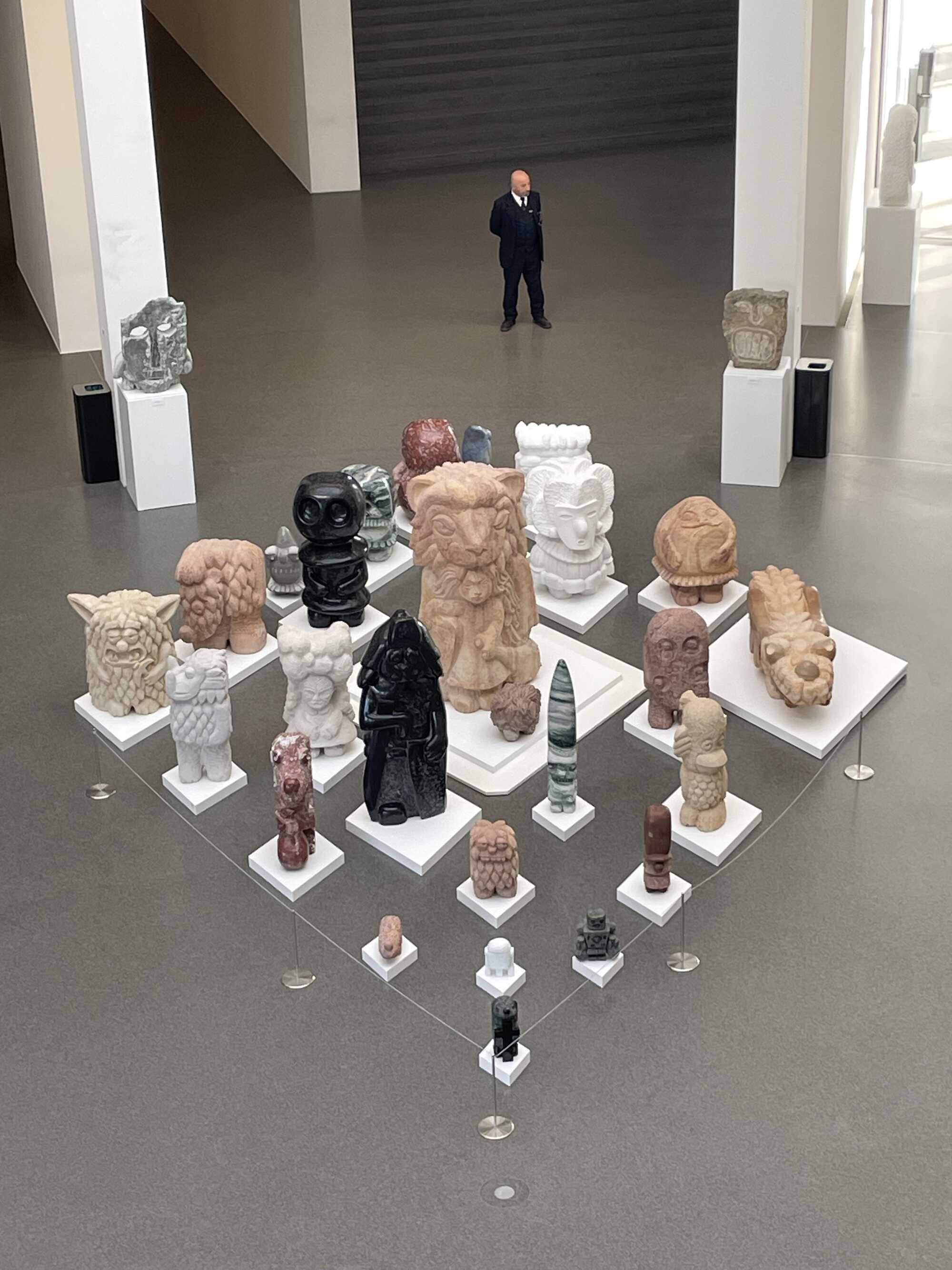 Anyway. Rinck, a trained stonemason, refers to his sculptures by specific names and (also) emphasises the tactile quality of the natural stones. One would love to touch them all; so inviting is the white marble of the āSnowrabbit Knightā, the blue Macaubas quartzite of the āRaindrop Ecuadorā, and the green quartzite of a āFrat Mateā with its white horizontal stripes, while the rough Elbe sandstone feels rather repellent to the touch. Beyond that, they are a visual treasure trove. Just like their colleagues āPerchtā, āRobotā, āFettklƶĆchenā (the fat dumpling), āMafioso Normandaiā, or āHoney Suckerā. They are reminiscent of Gothic gargoyles, Romanesque beast columns, ghosts, characters from pop culture, or the Mannerist figures in the āPark of Monstersā in the Italian town of Bomarzo, north of Rome. These figures, sometimes roughly hewn and at other times polished to a shine, open up realms of imagination and hold up a mirror to visitors. Inspired by Bavarian legends and folk customs, these sculptures are, however, primarily head-and-tilt figures. Seemingly rooted in popular folklore and playing on the cute, these stone heavyweights deftly teeter between silliness and seriousness. This blend of grandeur and humour brings contradictions and tensions to light. While Marius Müller-Westernhagenās songs are all about longing for the familiar and a sense of closeness to oneās homeland, Stefan Rinckās focus is on the loss of that very thing. The fact that the rural Alpine Clan has to find itself a new home in the urban rotunda of the āPinakothek der Moderneā says it all. All that remains for its members is the hope and belief that one day they will return to their familiar surroundings, just like over 100 million other people all over the world.Ā