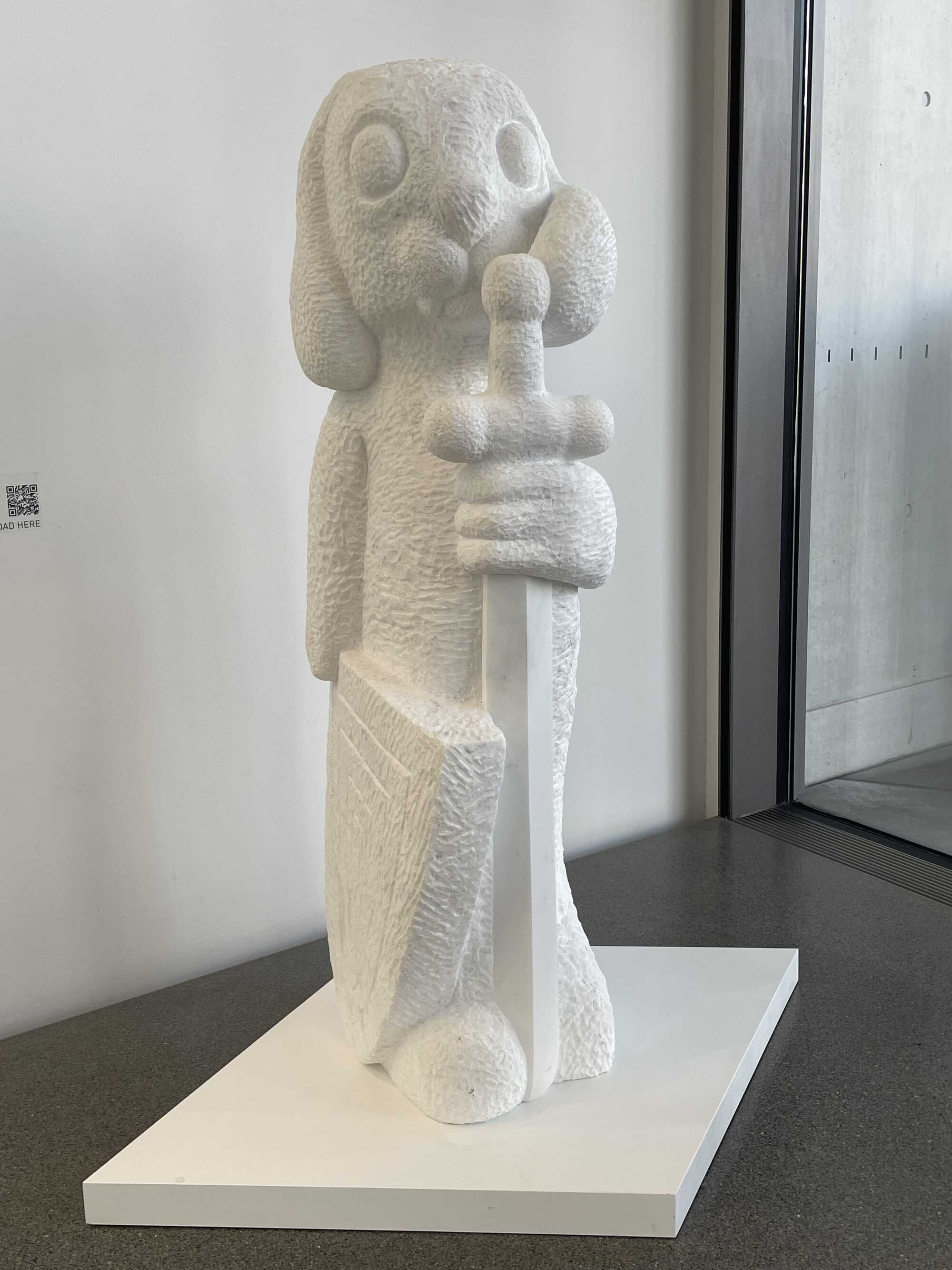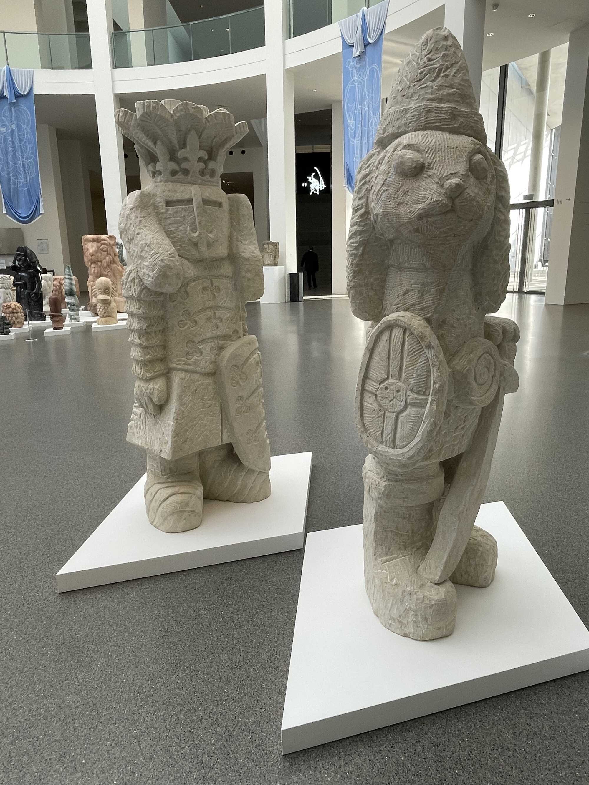 The leader of the Alpine Clan is a lioness holding a mace and a shield featuring the Bavarian state coat of arms ā a diamond pattern carved from red sandstone. This allusion to the (obviously!) male heraldic beast of Bavaria goes without saying. The lioness is flanked by a baby mammoth, also carved from red sandstone, a Japanese shield-bearer made of Belgian granite, and countless fantastical creatures chiselled from stones from all over the world. The lioness looks determined, the baby mammoth cute, and the bearer of the shield menacing. The lioness is the (spiritual) leader of this menagerie of strange, grotesque figures, both small and large. In the midst of it all, a myriad of hares romp around as bearers of shields and guards of honour. Hares? Hares! Anyone with even a passing knowledge of art history will sit up and prick their ears! From mediaeval scriptures to Dürer's āHareā and on to Baroque emblematics, and of course Joseph Beuys, who sought to explain art to a dead hare, the hare has long been held in high (artistic) esteem for its extraordinary powers of perception and adaptability. It wasn't until recently that he was trimmed down to a skittish rabbit, but that's another story.Ā